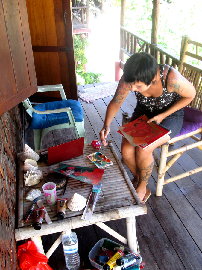 For digital painting from the other hand I had very little interest for many years and just try some small things from time to time. Suddenly I made a leap of faith and colored one of illustrations for client A (yes the same one I’m still working for 1,5 year later) in Photoshop even though first story I did was acrylic on paper, and my portfolio at this time was 100% traditional media. They said – “love it” and that was it! I started working in PS ONLY. That was right before our second ‘6 months’ in SE Asia and I took my box of paints, brushes and supplies of paper because yes – traveling + working with traditional media – totally doable. Here’s some proof: