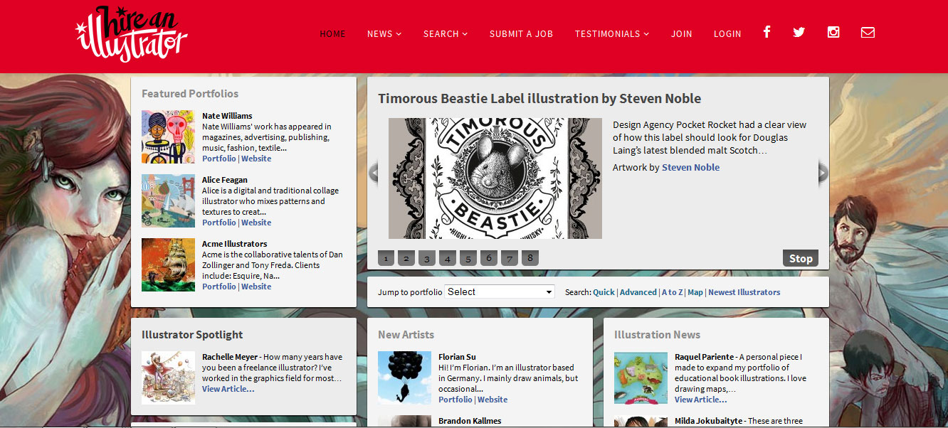 Hire and illustrator (HAI) is my fav way to answer some random people’s questions about “how your clients find you?” I lightly rolled my eyes and say “on hireanillustrator.com duh!”. As much as most people think I make fun of them this is a quite big platform with portfolios. There are, I guess all types of illustrations shown from my children’s niche to fashion, advertising – you name it! As you can see at main page there are regular spot lights, highlights etc. Every illustrator can submit some news connected with their work, like book publication, exhibition or even just a new personal work, and some of those news are being featured on main page and in newsletter. Pretty cool thing about HAI is while they ARE NOT agency, they are putting together physical packages with postcards and other printed promo materials and sending to art directors around the world.